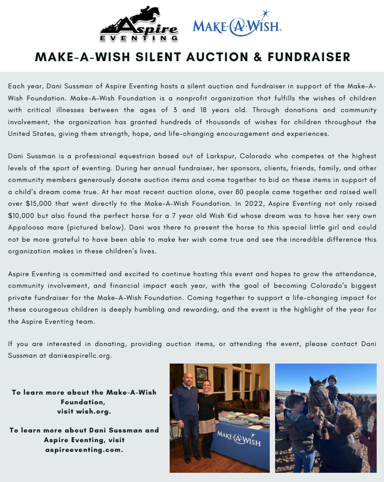 Aspire Eventing is the home of international three-day eventer Dani Sussman. Located in Larkspur, Colorado, Aspire Eventing offers full-service coaching, training, and sales services.